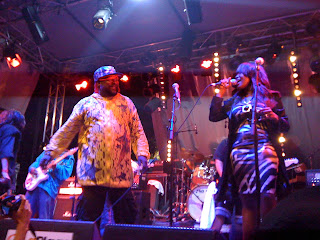 Torrential downpours and outdoor venues don’t mix. “(Not Just) Knee Deep” began with a lot of French folks heading for either les toilettes or the métro trains. An intoxicated woman at the lip of the stage started giving unappreciated lapdances to a man in a wheelchair, eventually falling on her behind. The sand quickly became mud. Amid the chaos, the band turned things down a notch, introducing singer Mary Griffin for some blues numbers. Griffin summarily blew the house down, whipping and wailing her gospel-tinged vocals in concert with the sheets of Parisian rain.